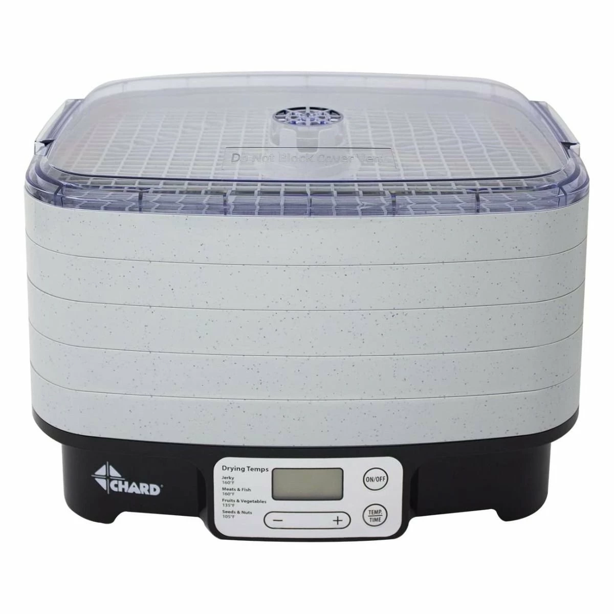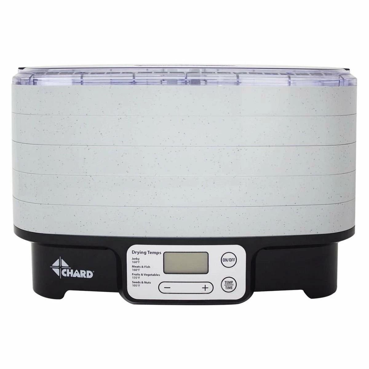 The Chard 5 Tray Digital Dehydrator is the ultimate food dehydrator for the modern hunter, gatherer, and forager. Made from food-grade plastic, this dehydrator allows you to process your own jerky, fruit, and herbs. It features a digital timer and temperature display that are both easy to read as well as an automatic shut-off. The five trays stack together to help lock in on the appropriate temperatures for what you are preparing, whether you are using low heat for produce or high heat for meats. Its convection drying system provides optimal air circulation throughout the unit for thoroughย drying results without having to rotate your trays. As it comes with five trays, it is completely expandable up to 25 trays for a jubilee of venison, fruit snacks, and dried herbs for seasoning. When you are done using the dehydrator, its cover and trays are dishwasher-safe for simple cleaning. Now prepare your game and your harvest exceptionally well with the Chard 5 Tray Digital Dehydrator!