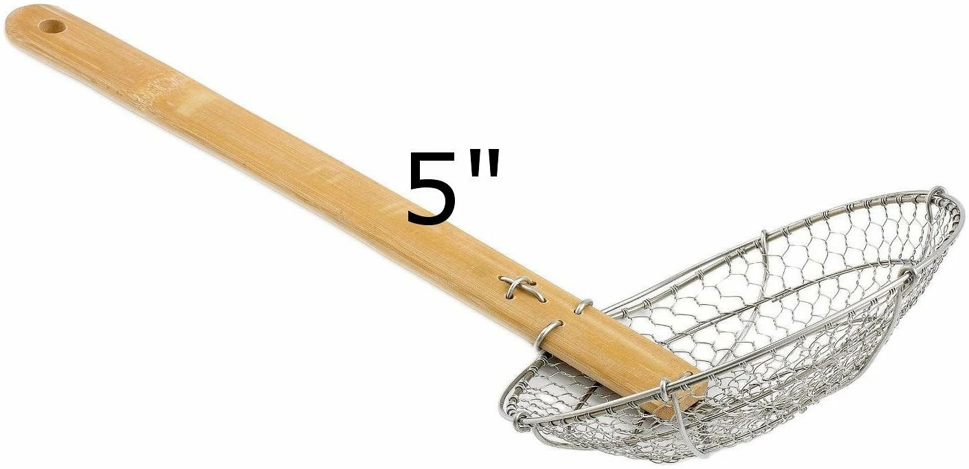 The 5-inch Spider Strainer from the Helen’s Asian Kitchen is a mesh strainer for lifting dumplings, wontons, fried fish, donuts, or other fare out of hot grease or water. The stainless-steel bowl’s large mesh design minimizes the amount of liquid collected with food items, allowing them to drain instantly. This leaves fried foods crisp and never soggy. The attractive bamboo handle is naturally heat resistant.