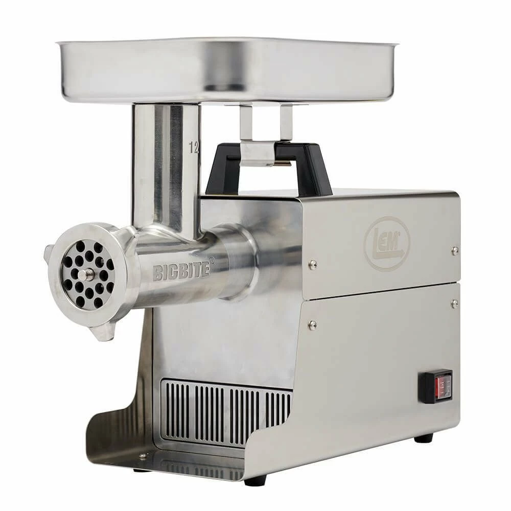 When itβs time to step up from an average kitchen grinder, itβs time for the LEM Big Bite Meat Grinder #12 17801-LEM. This LEM meat grinder is a 3/4-HP version of its large 1.5 HP grinder and is upgraded and improved with a rifled head, quieter gears, a larger-diameter throat, storage drawer under grinder head, and refined performance overall. Designed for heavier grinding tasks, this electric meat grinder grinds about 11 pounds of meat per minute. Features include a stainless steel motor housing, all metal gears with roller bearings, a built-in circuit breaker, and a 3/4-HP induction motor that is permanently lubricated for quiet operation. LEMβs exclusive Big Bite Technology allows the grinderβs auger to grab large chunks of meat and quickly feed them to the grinder head for a superior grind in record time. The rifled head design initiates an enhanced second grind to practically eliminate stomping and improve sausage stuffing. This grinder comes with everything you need to grind beef, pork, wild game, and even raw chicken bones for homemade pet food! The LEM Big Bite Meat Grinder includes a meat stomper, knife, stuffing plate, two grinding plates, three stuffing tubes, and a large meat pan. LEM covers its improved #12 meat grinder with a 5-year warranty and provides lifetime customer support, so youβre guaranteed to be grinding meat for sausage, jerky, salami, burgers and more for years to come.