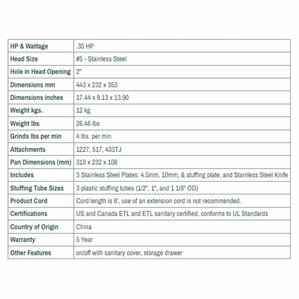 When itβs time to step up from an average kitchen grinder, itβs time for the LEM Big Bite Meat Grinder #5 17771-LEM. This LEM meat grinder is a .35-HP version of its larger 1.5 HP grinder big brother, and is upgraded and improved with a rifled head; large-diameter, offset throat; quieter gears; and refined performance overall. Designed for smaller grinding tasks, this electric meat grinder grinds about four pounds of meat per minute. Features include a stainless steel motor housing, all metal gears with roller bearings, a built-in circuit breaker, and a .35-HP induction motor that is permanently lubricated for quiet operation. LEMβs exclusive Big Bite Technology allows the grinderβs auger to grab large chunks of meat and quickly feed them to the grinder head for a superior grind in record time. The rifled head design initiates an enhanced second grind to practically eliminate stomping and improve sausage stuffing. Everything you need to grind beef, pork, and wild game comes with the LEM Big Bite Meat Grinder, including a meat stomper, knife, stuffing plate, two grinding plates, three stuffing tubes, and a large meat pan. LEM covers its improved #5 meat grinder with a 5-year warranty and provides lifetime customer support, so youβre guaranteed to be grinding meat for sausage, jerky, burgers, and more for years to come.