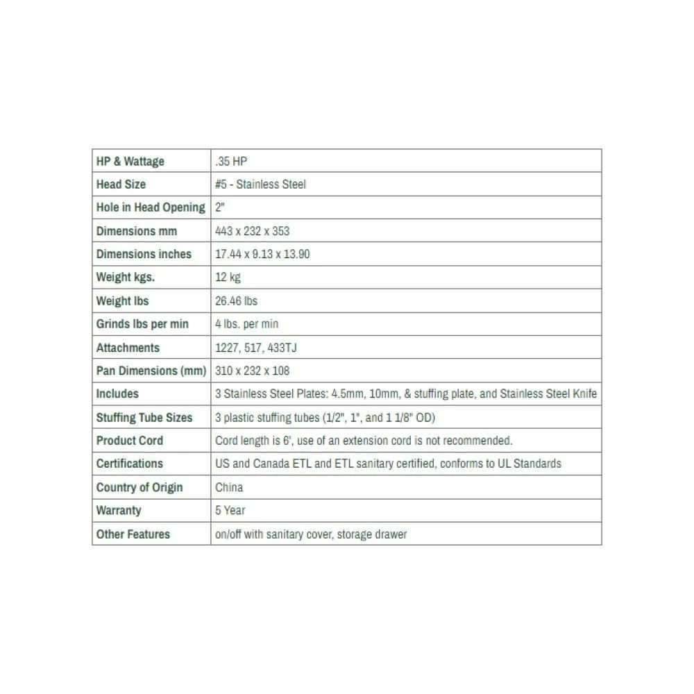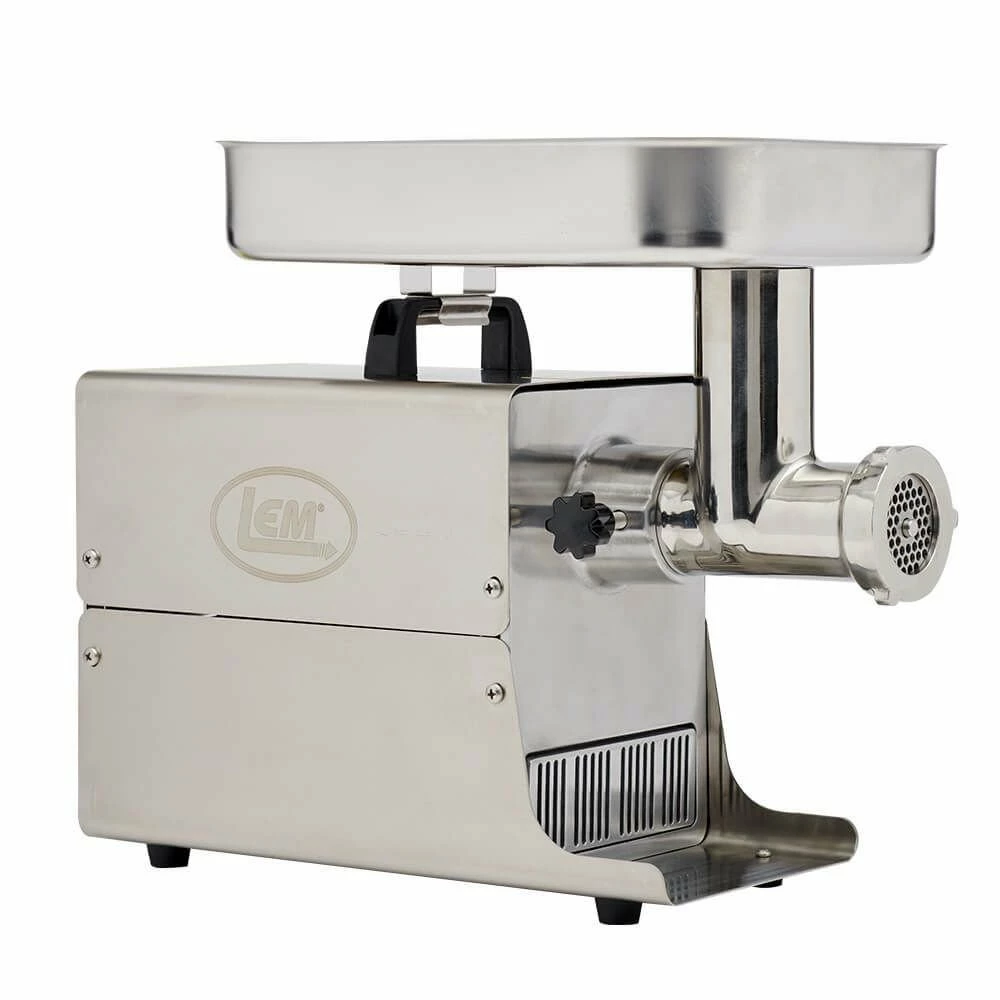 When itβs time to step up from an average kitchen grinder, itβs time for the LEM Big Bite Meat Grinder #5 17771-LEM. This LEM meat grinder is a .35-HP version of its large 1.5 HP grinder, and is upgraded and improved with a rifled head; large-diameter, offset throat; quieter gears; and refined performance overall. Designed for smaller grinding tasks, this electric meat grinder grinds about four pounds of meat per minute. Features include a stainless steel motor housing, all-metal gears with roller bearings, a built-in circuit breaker, and a .35-HP induction motor that is permanently lubricated for quiet operation. LEMβs exclusive Big Bite Technology allows the grinderβs auger to grab large chunks of meat and quickly feed them to the grinder head for a superior grind in record time. The rifled head design initiates an enhanced second grind to practically eliminate stomping and improve sausage stuffing. Everything you need to grind beef, pork, and wild game comes with the LEM Big Bite Meat Grinder, including a meat stomper, knife, stuffing plate, two grinding plates, three stuffing tubes and a large meat pan. LEM covers its improved #5 meat grinder with a 5-year warranty and provides lifetime customer support, so youβre guaranteed to be grinding meat for sausage, jerky, burgers, and more for years to come.