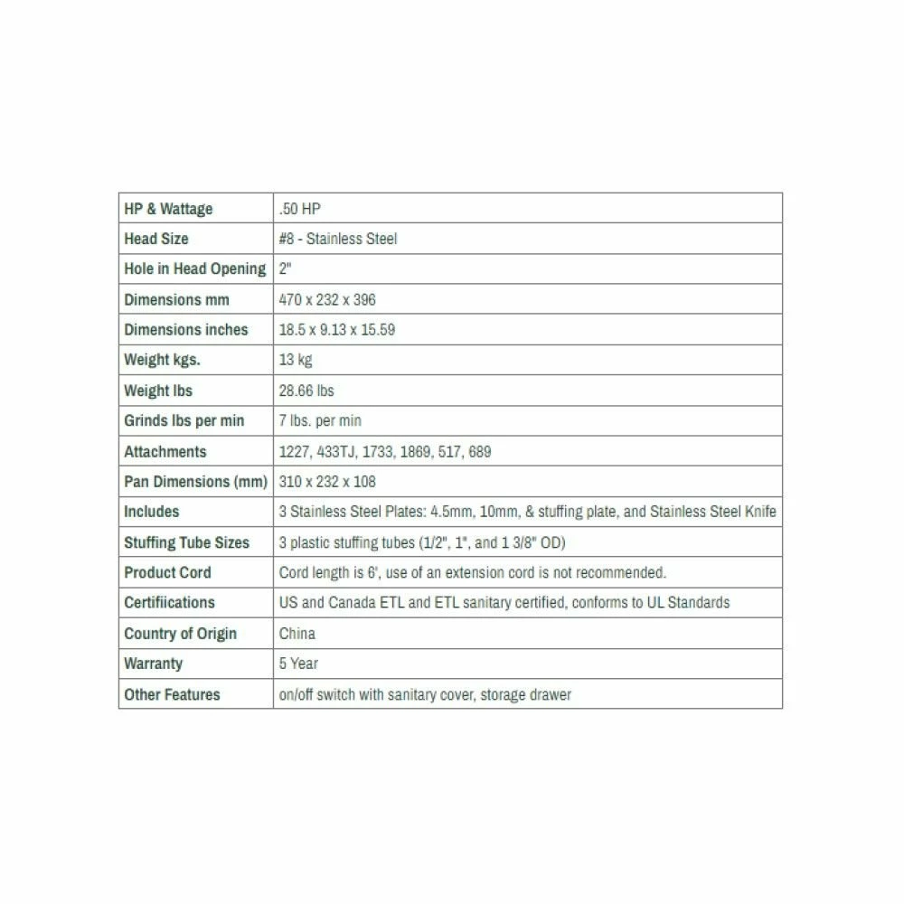When itβs time to step up from an average kitchen grinder, itβs time for the LEM Big Bite Meat Grinder #8. This LEM meat grinder is a 0.5-HP version of its larger 1.5 HP grinder big brother and is upgraded and improved with a rifled head, quieter gears, and refined performance overall. Designed for regular grinding tasks, this electric meat grinder grinds about seven pounds of meat per minute. Features include a stainless steel motor housing, all metal gears with roller bearings, a built-in circuit breaker, and a .05 HP induction motor that is permanently lubricated for quiet operation. LEMβs exclusive Big Bite Technology allows the grinderβs auger to grab large chunks of meat and quickly feed them to the grinder head for a superior grind in record time. The rifled head design initiates an enhanced second grind to practically eliminate stomping and improve sausage stuffing. Everything you need to grind beef, pork, and wild game comes with the LEM Big Bite Meat Grinder, including a meat stomper, knife, stuffing plate, two grinding plates, three stuffing tubes, and a large meat pan. LEM covers its improved #8 meat grinder with a 5-year warranty and provides lifetime customer support, so youβre guaranteed to be grinding meat for sausage, jerky, salami, burgers, and more for years to come.