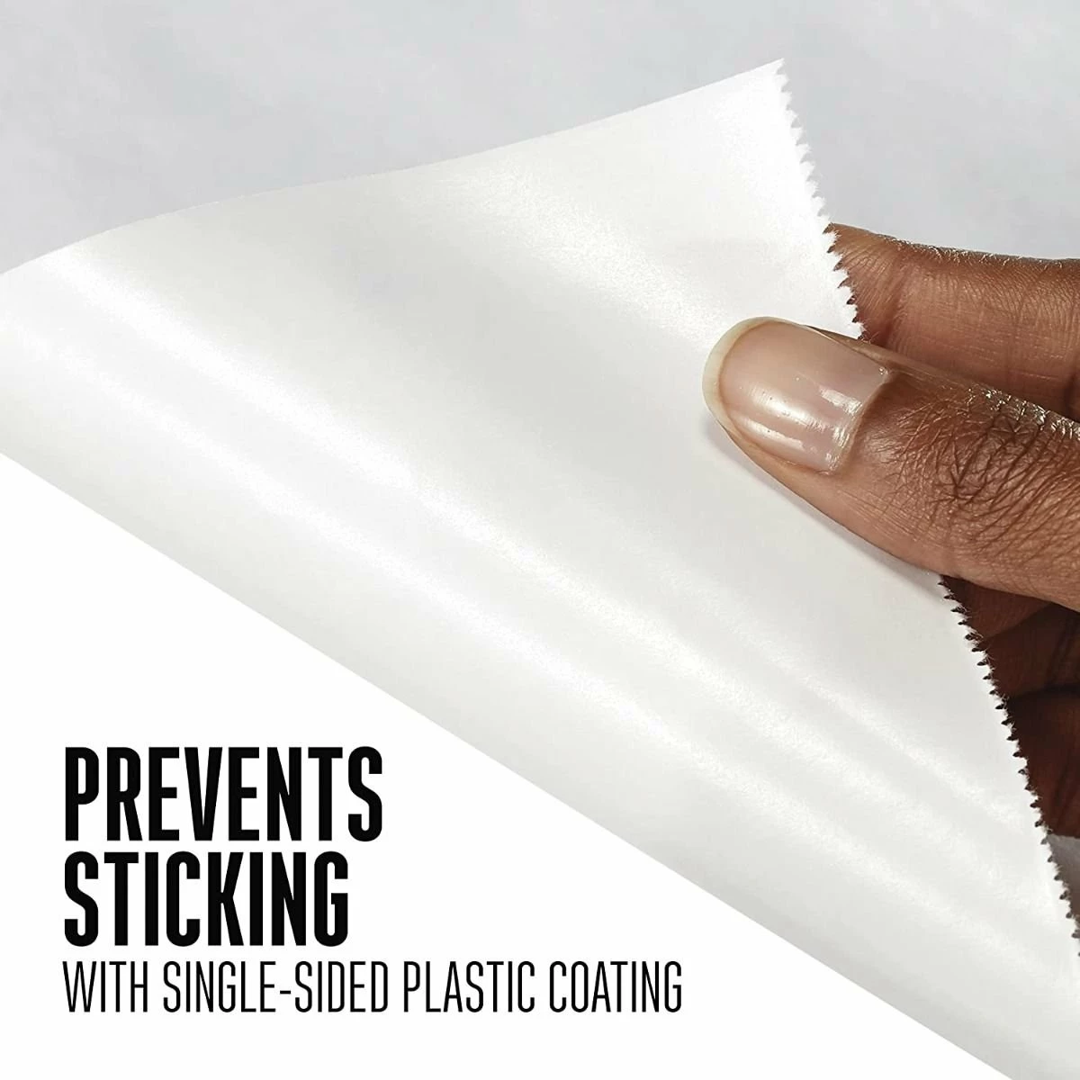 - Single-sided plastic poly-coating prevents meats and other foods from sticking to the paperย