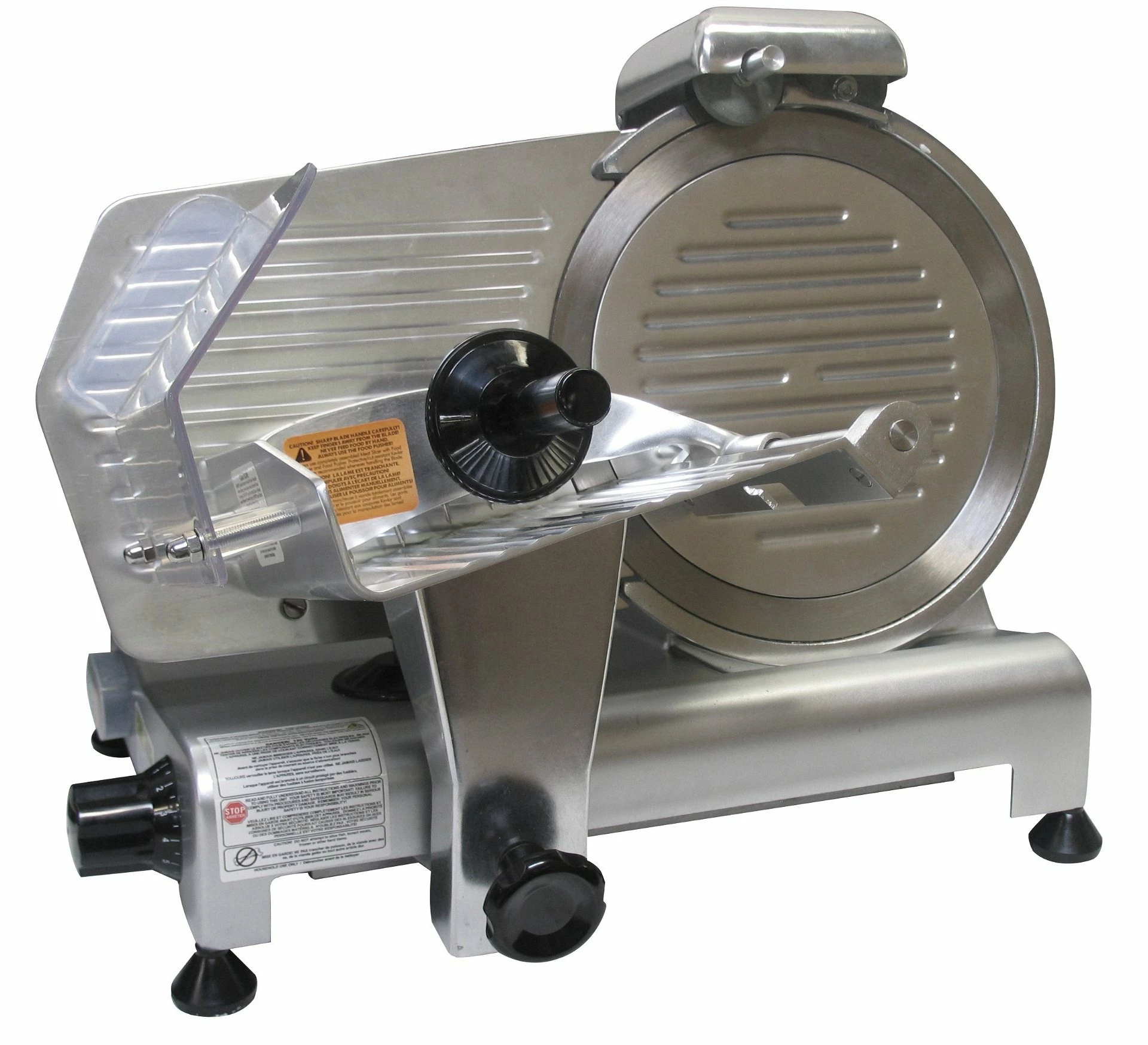 Slice deli meats efficiently with the Weston Pro 1β Meat Slicer. This mean, meat-slicing machine comes with a 0.4 HP (320 watt), belt-driven motor. The stainless steel blade has a 10β diameter and can tackle and slicing job, as it spins at 460 RPM. Never worry about the blade dulling, either, because the slicer comes with a detachable, dual-sided blade sharpener. Adjust the thickness of your slices between paper thin and 1/2″. The gliding carriage offers smooth slicing with the food pusher that secures the food for controlled slicing. The large base in the back will catch the sliced meat as it falls from the blade. No need to worry about the machine moving around either, because the sturdy, solid base comes with suction cup feet for stable slicing. For the best in meat processing, go with Weston!