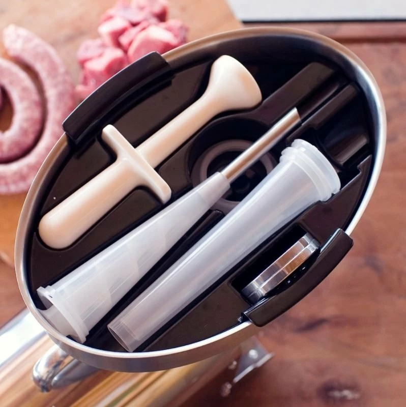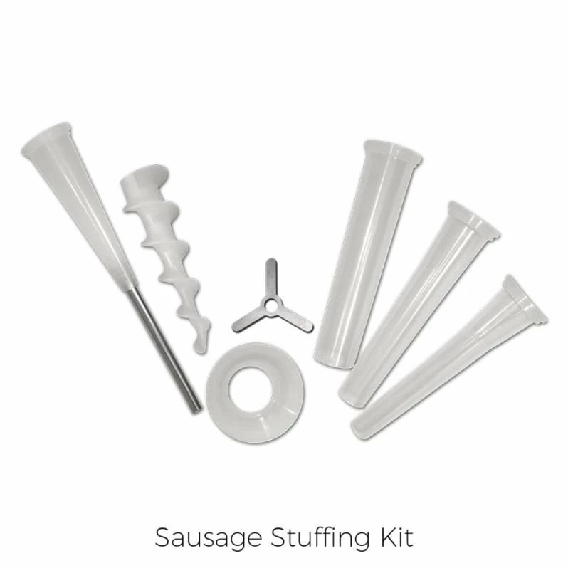 • Sausage Stuffing Kit (20mm, 30mm, and 40mm funnels, 10mm snack stick funnel, high-speed auger, stuffing star/spacer)
